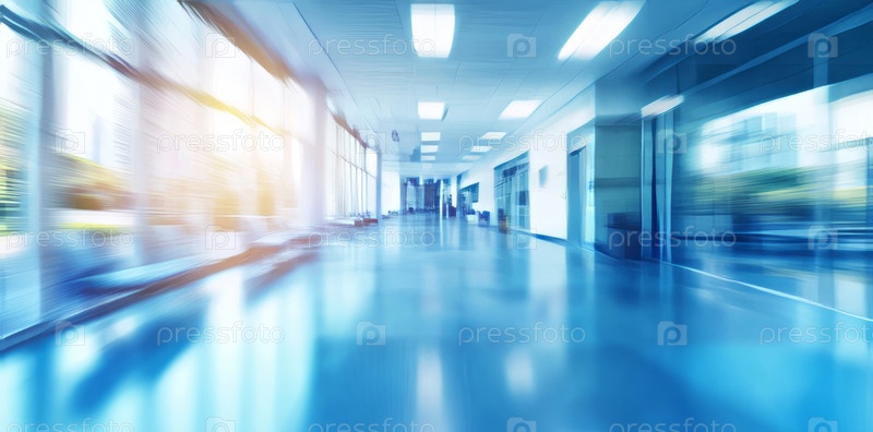 Современный больничный коридор с синими полами и зоной отдыха