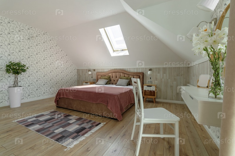 Уютная спальня на чердаке с современной мебелью и естественным освещением через потолочное окно