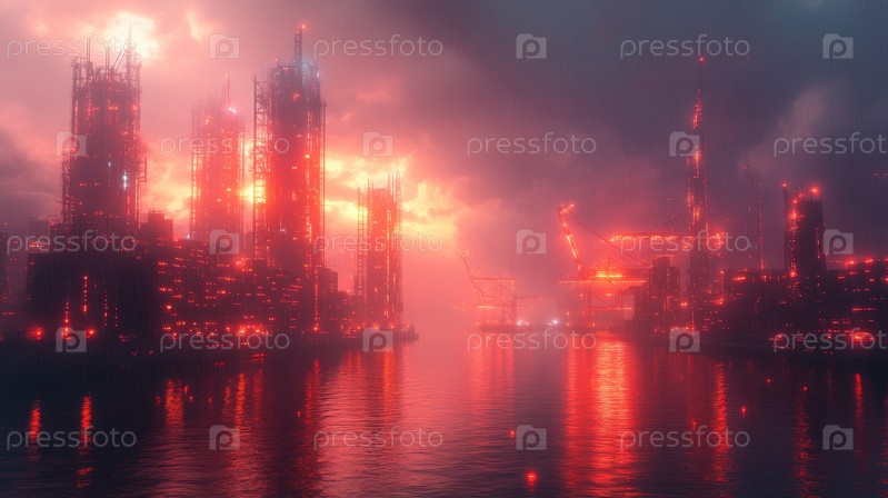 Киберпанковский городской пейзаж с неоновыми огнями и дождем