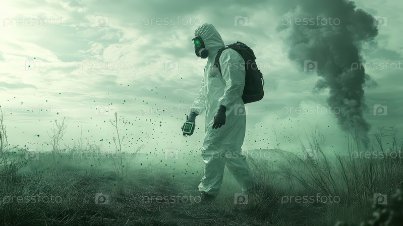 Человек в защитном костюме идет по загрязненной местности с токсичным воздухом