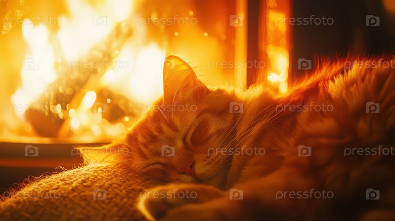 Кот мирно спит у камина