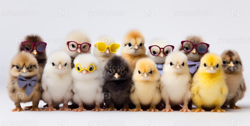 Панорама множества молодых пушистых пасхальных цыплят, стоящих на белом фоне
