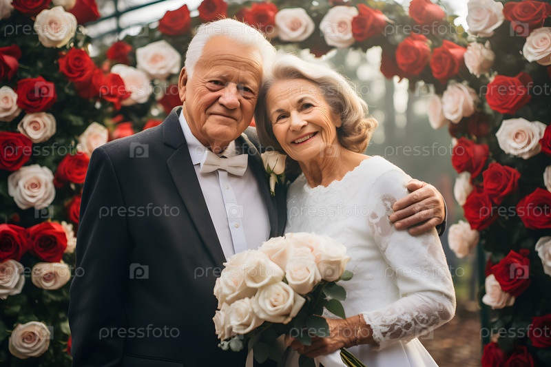 Пожилая пара, невеста и жених в цветущем саду, праздничная свадебная атмосфера