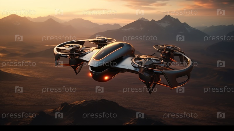 Военный FPV-дрон парит над обширным пустынным ландшафтом с далекими горами