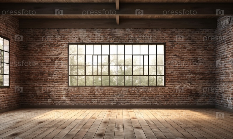 Интерьер комнаты с незаконченным ремонтом, кирпичной стеной и окном