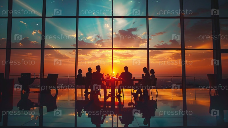 Совместная работа команды в офисе со стеклянными стенами на закате