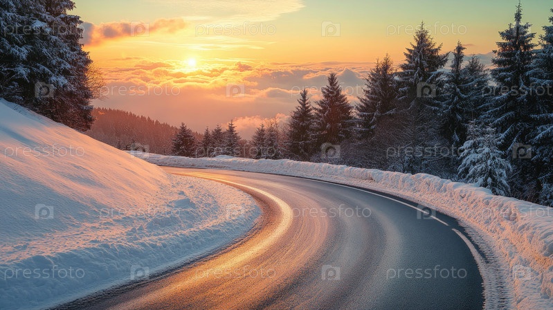 Извилистая дорога петляет по заснеженному горному ландшафту под потрясающим закатом