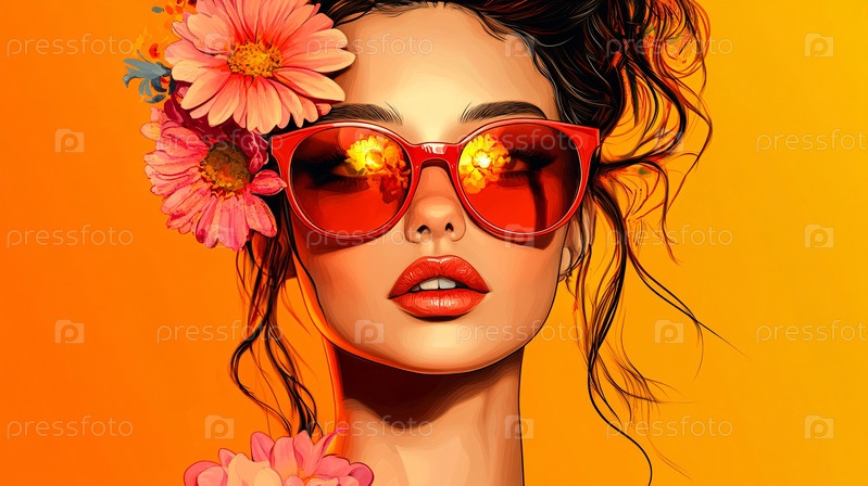 Яркий портрет с цветочным головным убором на оранжевом фоне