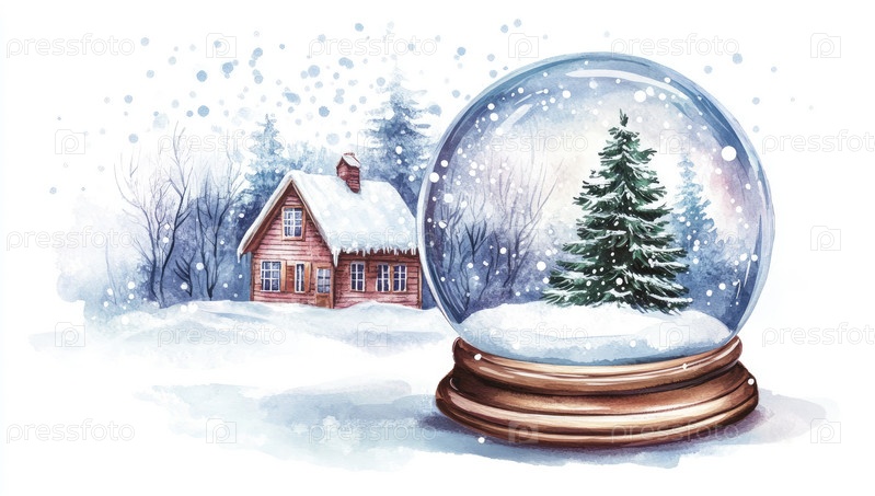 Уютный домик в заснеженном лесу и декоративный снежный шар с рождественской елкой создают волшебную зимнюю картину