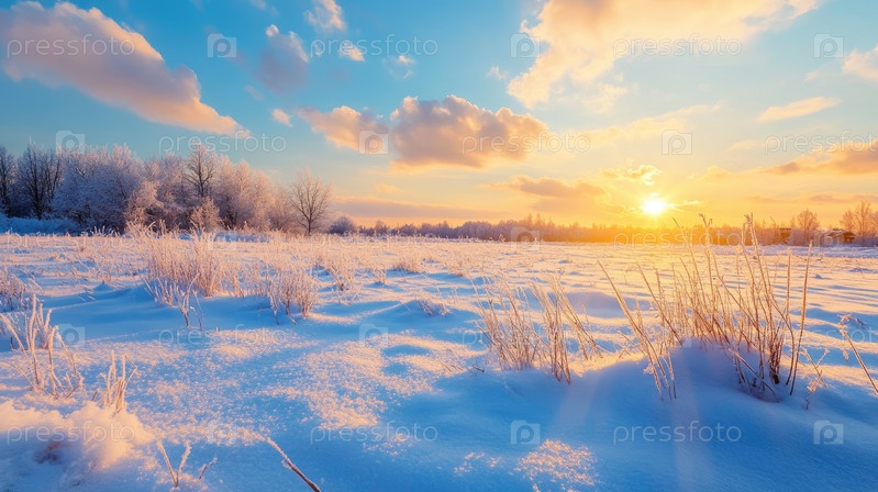 Захватывающий восход солнца освещает огромное, мирное заснеженное поле с деревьями, покрытыми инеем, и чистым голубым небом