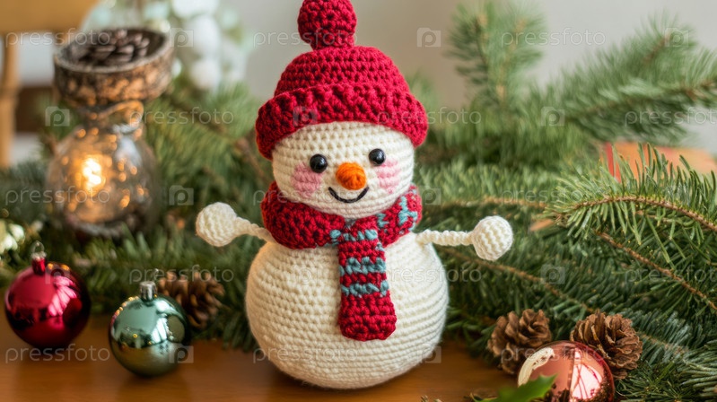 Праздничный вязаный крючком снеговик с праздничными украшениями