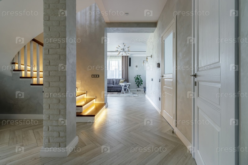 Современный дом открытой планировки со стильной лестницей и уютной гостиной