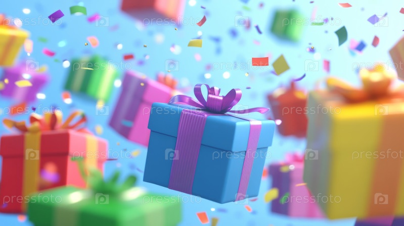 Ярко упакованные подарки среди ярких конфетти и радостных праздников