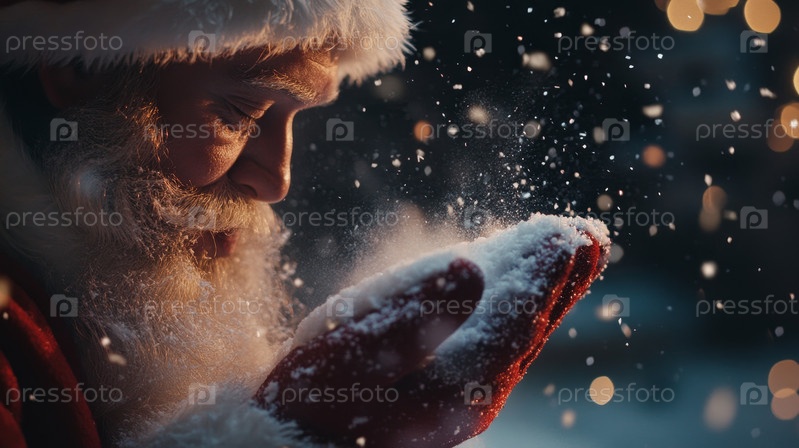 Руки Санты держат снежинки, окруженные светящимися огнями, создавая волшебную праздничную атмосферу