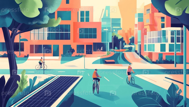 Футуристический городской пейзаж с велосипедом и устойчивой архитектурой