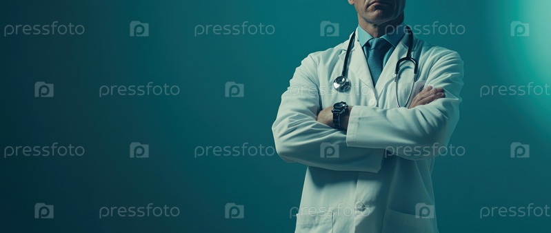 На этом изображении изображен уверенный в себе медицинский работник в современной клинике со стетоскопом в руках, что символизирует доверие и профессионализм в сфере медицинских услуг