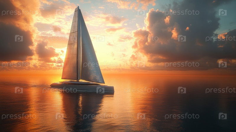 Футуристическая роскошная парусная лодка на закате над спокойным океаном