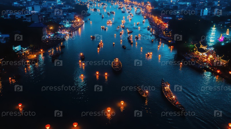 Праздник фонарей над рекой ночью