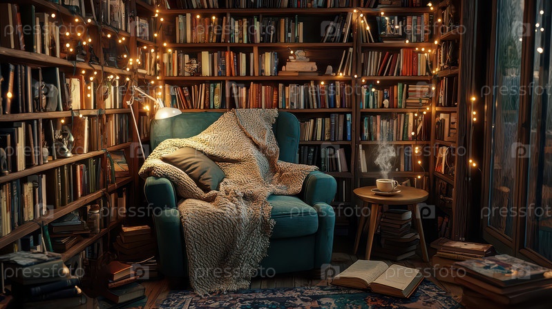 Уютный уголок для чтения с книгами и теплым светом