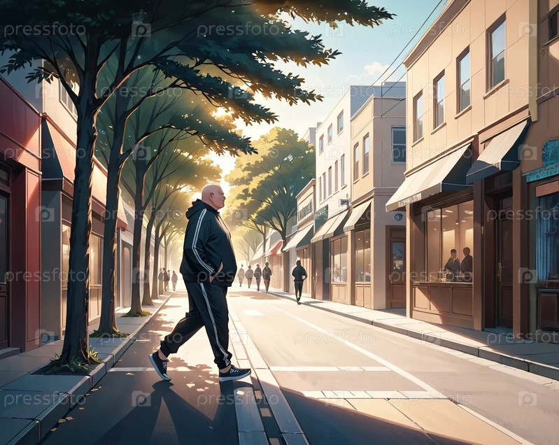 Толстый мужчина в спортивном костюме бежит по тротуару в городе