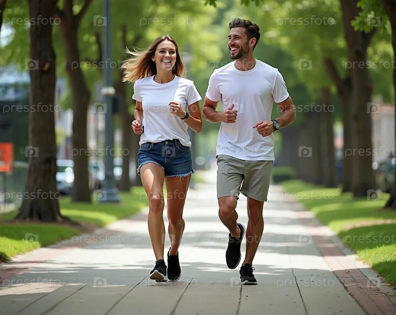 Мужчина и женщина в футболках и шортах бегут по тротуару