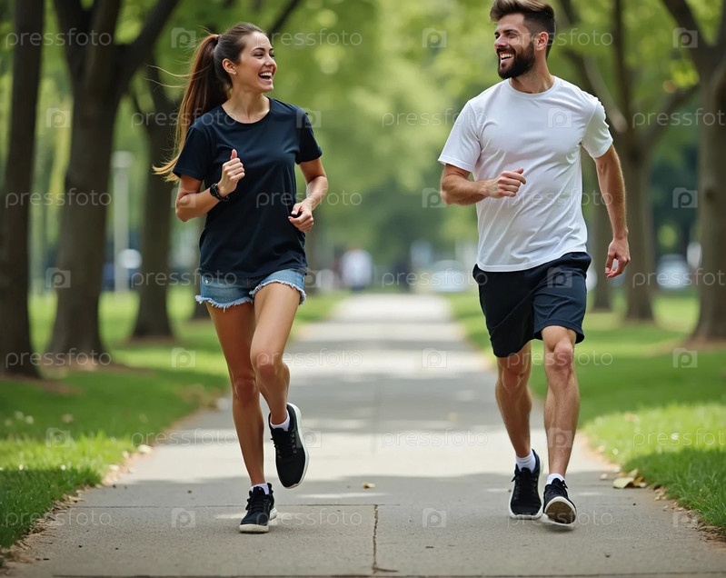 Мужчина и женщина в футболках и шортах бегут по тротуару