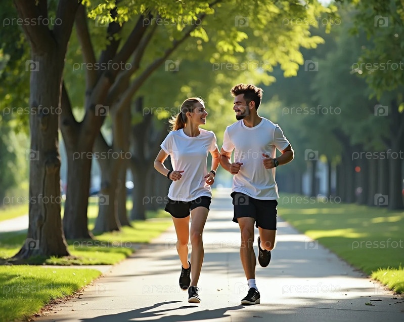 Мужчина и женщина в футболках и шортах бегут по тротуару