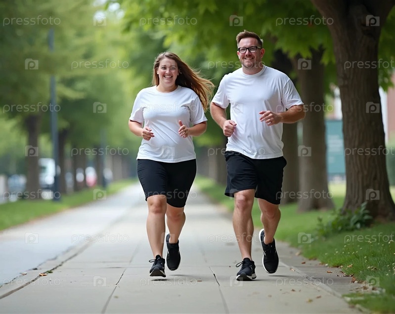 Толстые мужчина и женщина в футболках и шортах бегут по тротуару