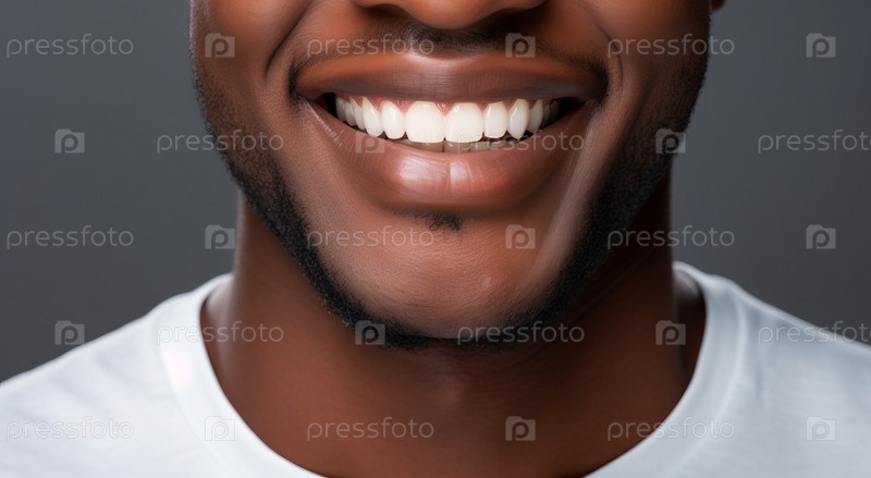 Крупным планом студийный снимок африканского парня, указывающего пальцем на белую блестящую зубастую улыбку, концепция отбеливания зубов, стоматологическая помощь, стоматологические услуги и концепция рекламы продуктов