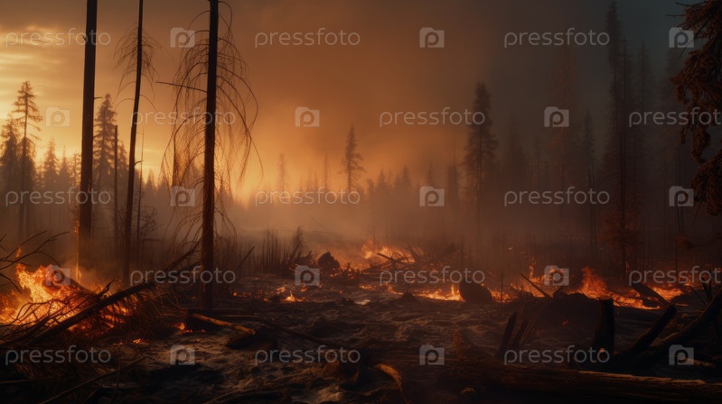 Пожар охватывает лес и сухую траву, оставляя на земле черный слой гари и пепла