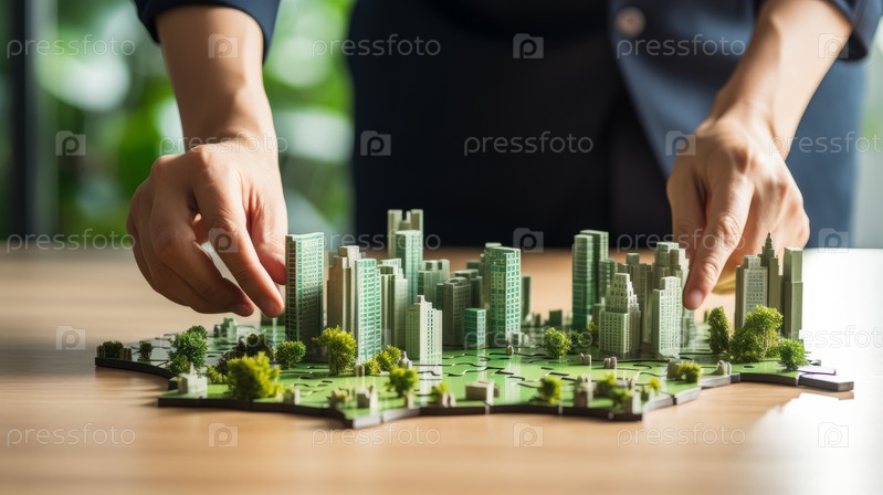Крупным планом показаны руки мужчин-архитекторов или застройщиков, анализирующих совместный проект будущего жилого комплекса