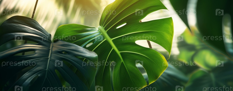Фон из зеленых листьев тропических джунглей, папоротника, пальмы и листьев Monstera Deliciosa на стене с темно-зеленым, фоном концепции цветочного лесного растения, горизонтальным