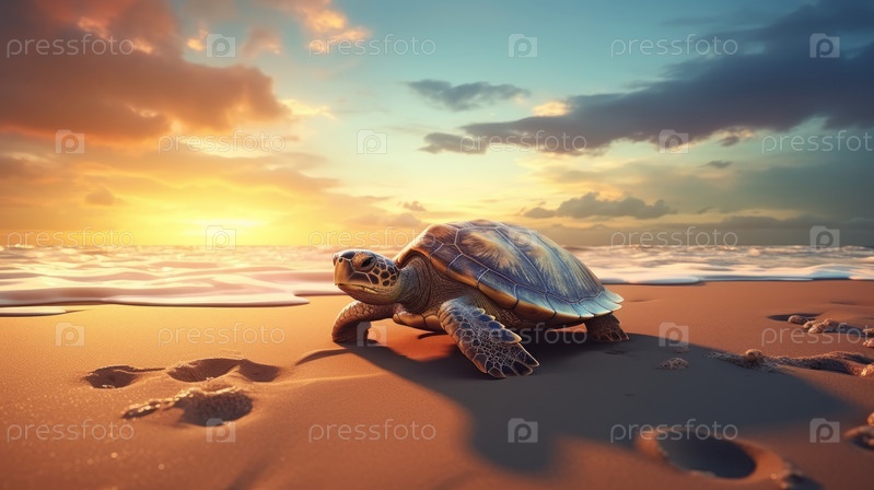Маленькая морская черепаха на песчаном пляже утром