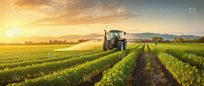 Трактор распыляет пестициды и удобрения на соевых бобах на сельскохозяйственных полях