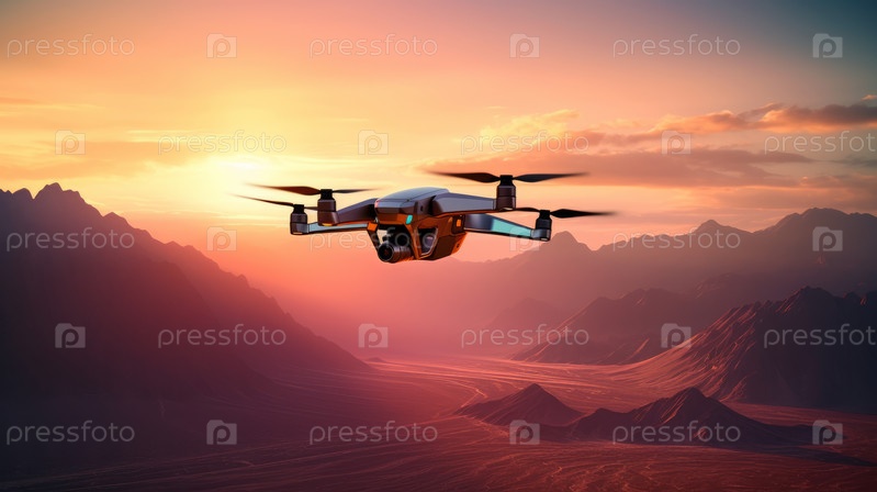 Военный дрон FPV, парящий над обширным пустынным ландшафтом с далекими горами