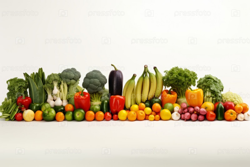 Композиция из фруктов и овощей, изолированных на белом фоне. Красивая широкая рамка со свободным пространством для текста. Коллаж