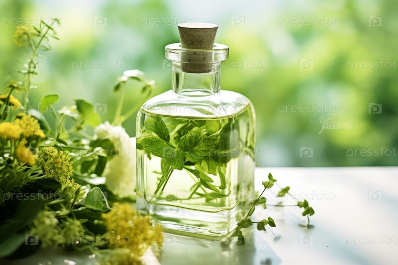 Различные целостные травы в бутылках с маслом в ряд на деревянной доске, светлый фон. Ромашка, календула, базилик травяная ароматерапия