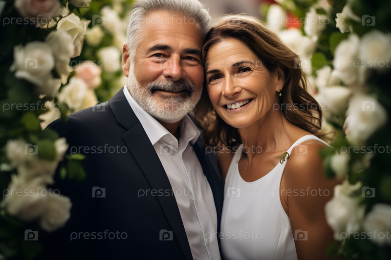 Пожилая пара, невеста и жених в цветущем саду, праздничная свадебная атмосфера