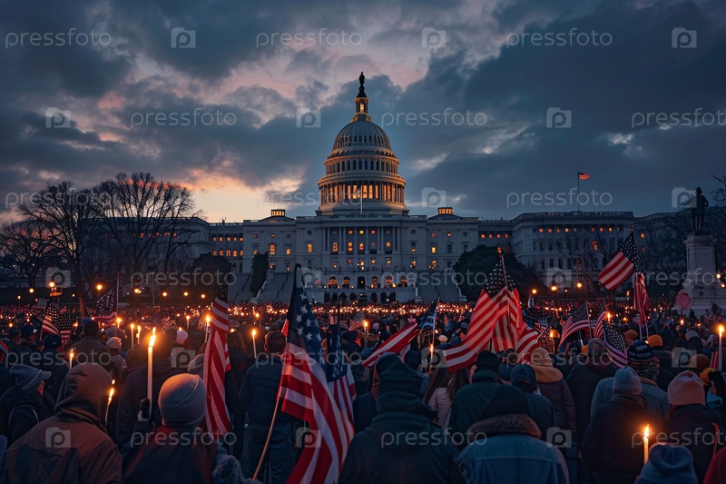 Толпа людей с американскими флагами и факелами собирается перед зданием Капитолия США в сумерках, демонстрируя гражданское единство и патриотизм