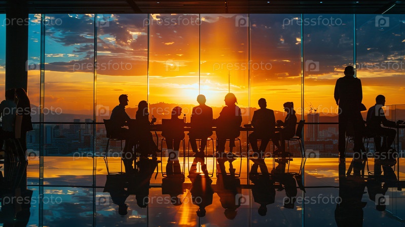 Совместная работа команды в офисе со стеклянными стенами на закате