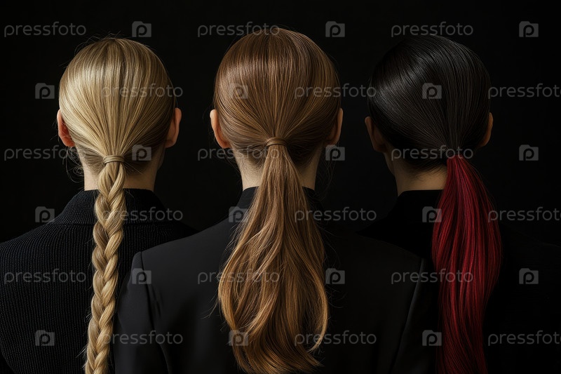 Фотография, демонстрирующая вид сзади трех человек с элегантно уложенными хвостиками в оттенках блонда, светло-каштанового и брюнета, подчеркивающая различную текстуру волос и эстетику
