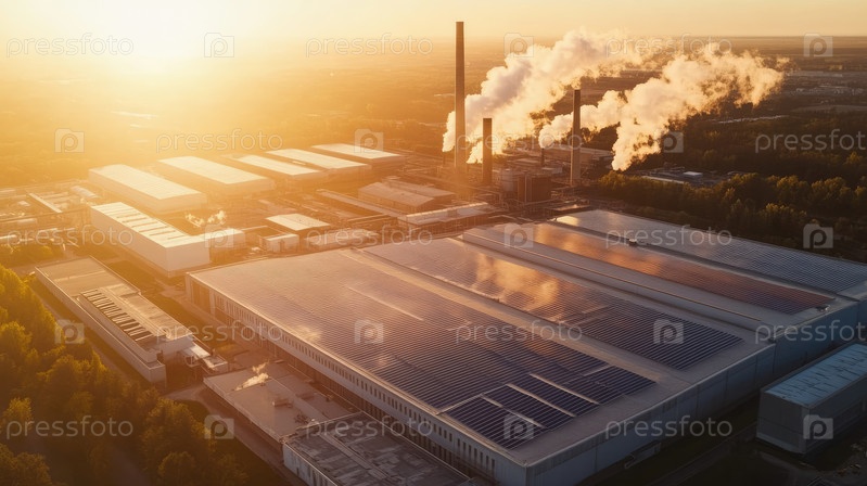 На этом снимке с воздуха запечатлен промышленный завод с солнечными панелями, испускающими дым, под заходящим солнцем