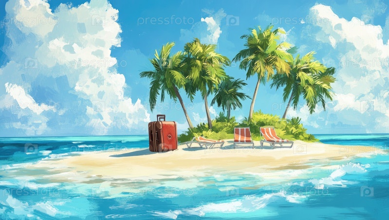 Солнечный райский остров с пальмами и спокойными водами