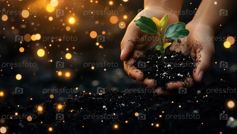 Пара рук нежно держит маленький саженец в почве, символизируя рост и зарождение новой жизни
