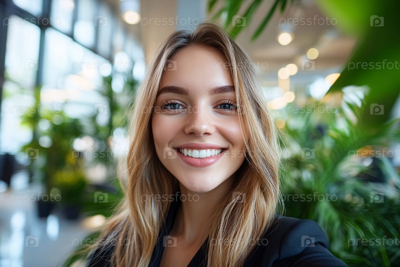 Профессиональное селфи в современном зеленом офисе с солнечным светом и растениями
