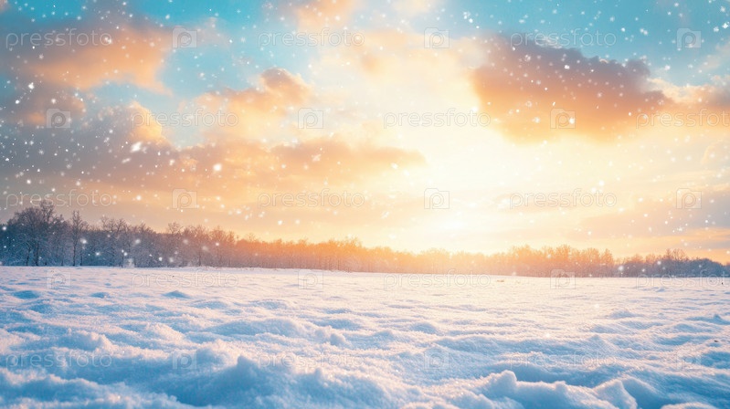 Захватывающий восход солнца освещает огромное, мирное заснеженное поле с деревьями, покрытыми инеем, и чистым голубым небом