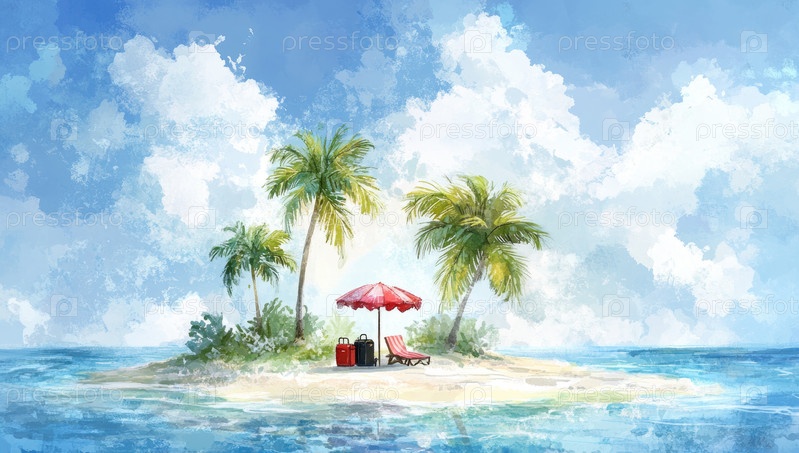 Солнечный райский остров с пальмами и спокойными водами
