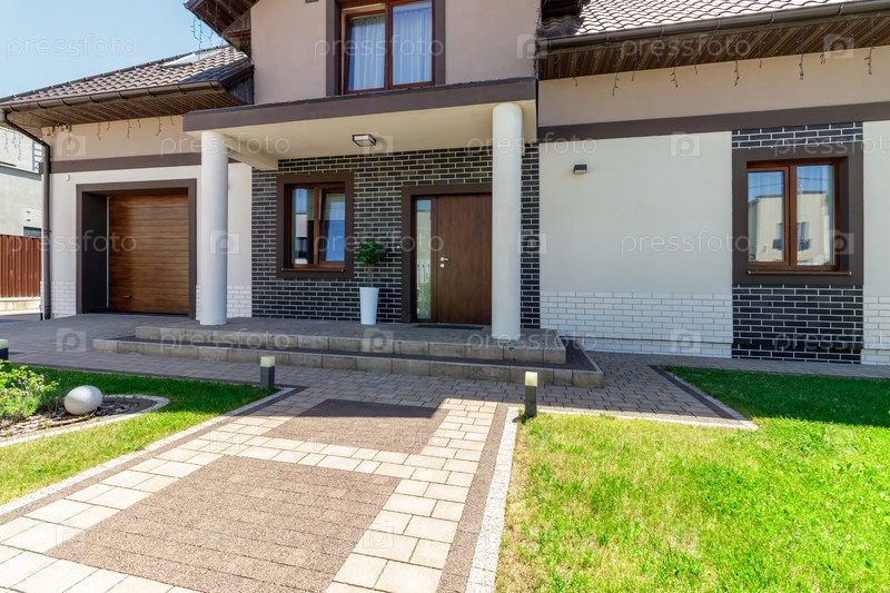 Великолепно спроектированный современный дом с кирпичными деталями, благоустроенным двором и уютной входной дорожкой