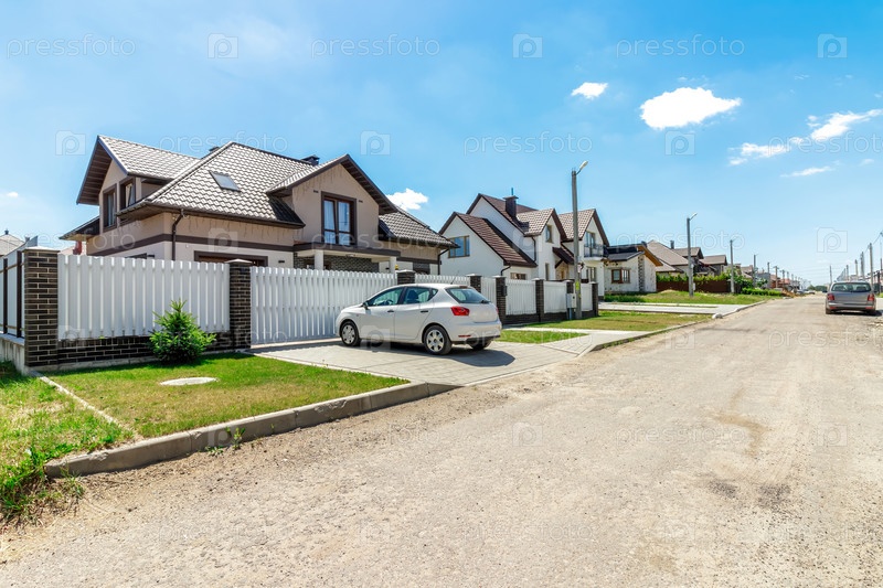 Современный загородный дом с подъездной дорожкой с припаркованной машиной, белым забором, кирпичными деталями и ясным солнечным небом