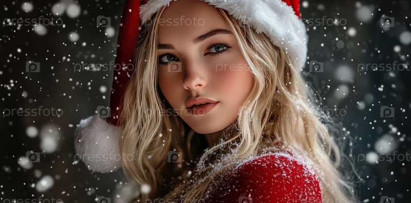 Женщина в шапке Санты стоит среди мягко падающего снега, олицетворяя праздничную радость и тепло предновогоднего сезона